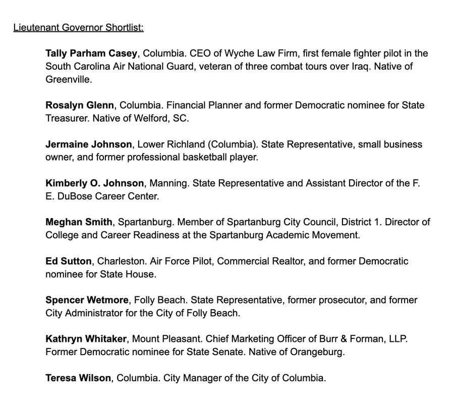 Joe Cunningham Reveals Prospective Lt Governor Candidates